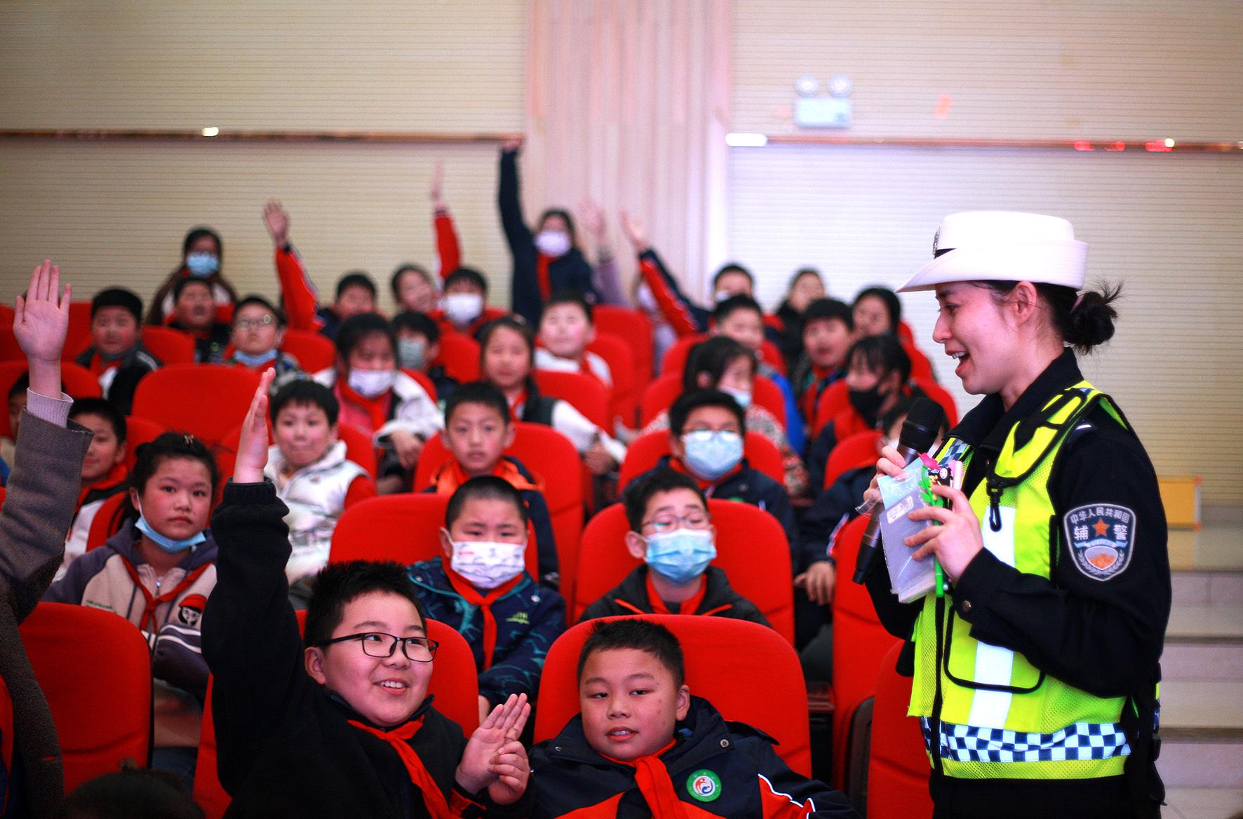 3月28日,遼寧省阜新市公安局交警支隊民警在“阜新市中小學(xué)生安全教育周啟動儀式暨太平區(qū)現(xiàn)場觀摩會”講解交通安全知識。