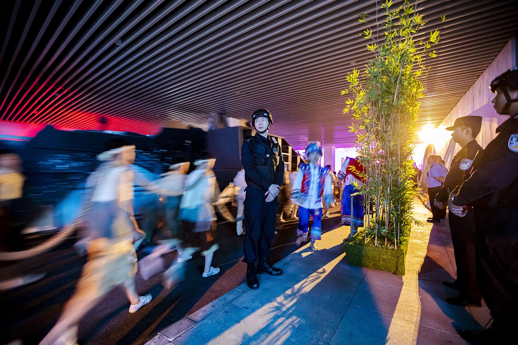 圖為民輔警在演職人員通道維護(hù)秩序。