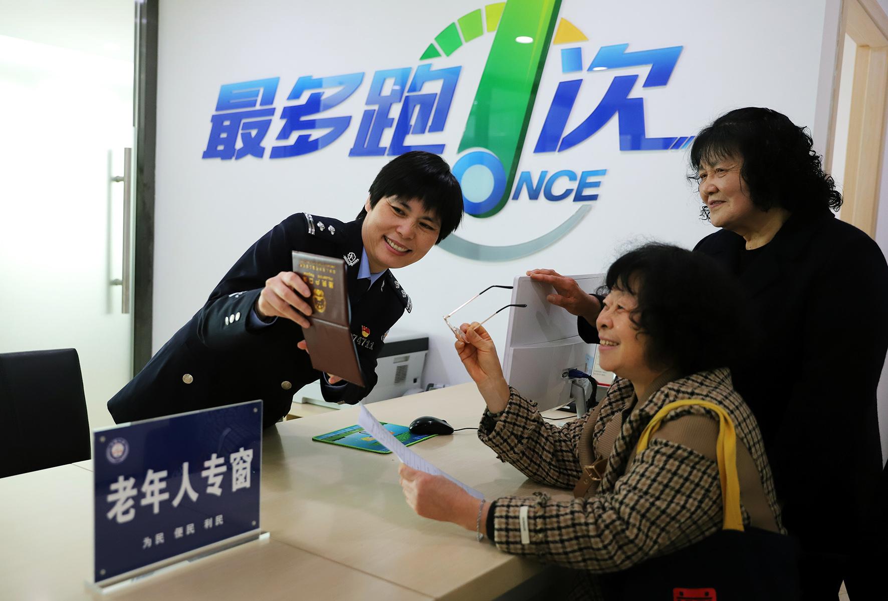 4月7日,浙江省臺州市公安局路橋分局橫街派出所民警在“老年人專窗”為老年人辦理戶籍業(yè)務(wù)。今年以來,臺州市公安局路橋分局為方便老年人辦事,各辦證窗口專門開設(shè)了老年人服務(wù)窗口。