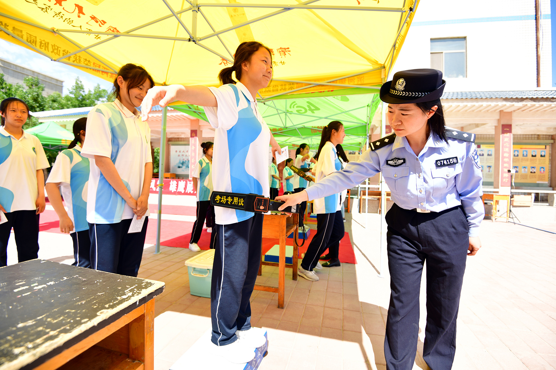 6月6日,甘肅省臨澤縣公安局開發(fā)區(qū)派出所民輔警組織轄區(qū)高三年級全體學(xué)生進(jìn)行高考安檢規(guī)范演練,幫助考生提前熟悉高考入場流程。