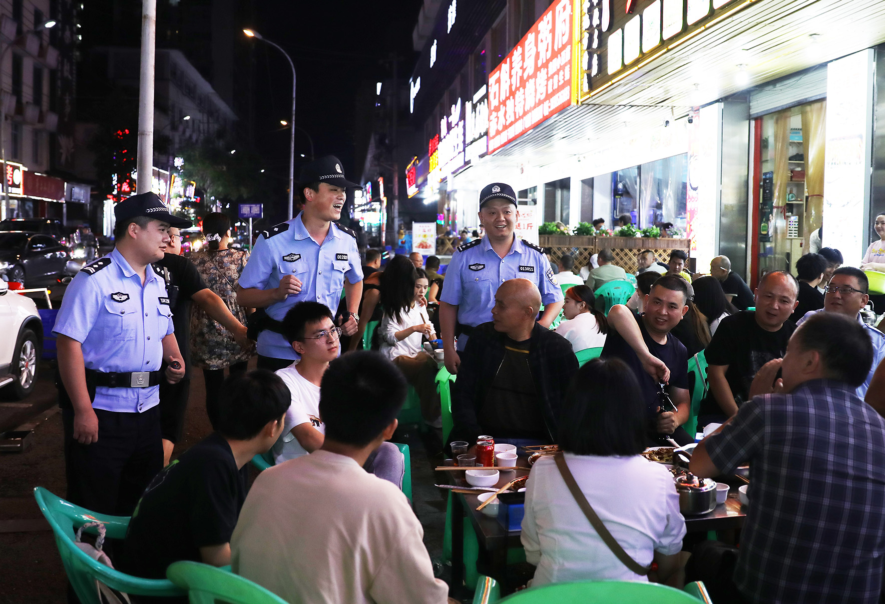6月5日晚,貴州省赤水市公安局文華派出所民警在燒烤攤點(diǎn)提示市民共同營造良好的高考氛圍。