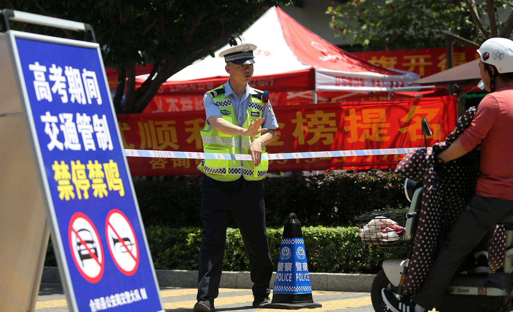 6月6日,陜西省渭南市合陽縣公安局交通管理大隊(duì)民警在合陽中學(xué)考點(diǎn)外擺放交通標(biāo)志牌,并提醒群眾高考期間請繞行。