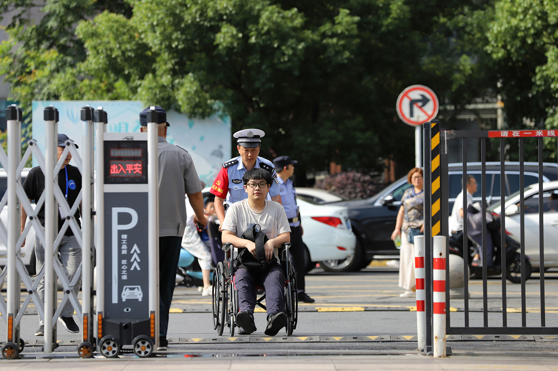 6月7日,山東省棗莊市公安局薛城分局民警在轄區(qū)棗莊第八中學(xué)考點(diǎn)幫助行動(dòng)不便的考生進(jìn)入考場。