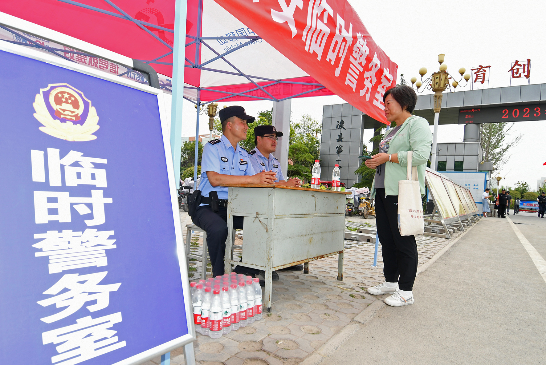 6月7日,河南省??h公安局在高考考點(diǎn)設(shè)立“愛心護(hù)考”執(zhí)勤點(diǎn),為考生及家長提供溫馨服務(wù)。