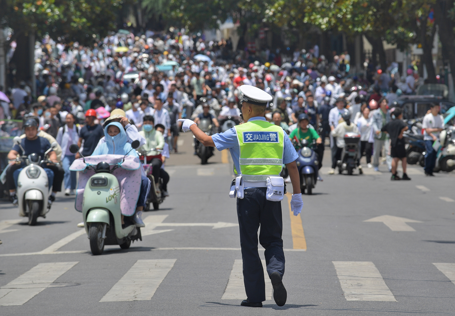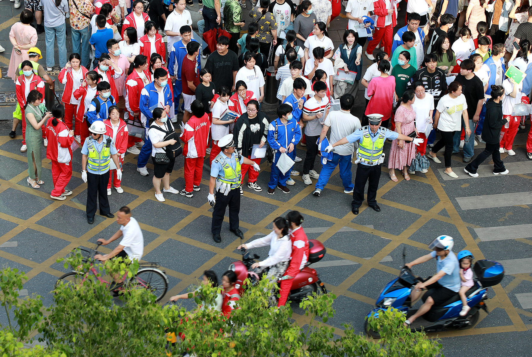 6月8日,安徽省巢湖市公安局交警大隊(duì)民輔警在維護(hù)高考考生散場后的路面交通秩序。