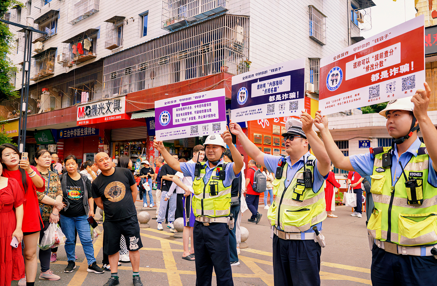 6月7日,四川省綿陽市公安局針對(duì)提前查分、修改分?jǐn)?shù)等詐騙行為,在多個(gè)考場外設(shè)置宣傳點(diǎn),組織民警向等候的家長開展防詐宣傳。