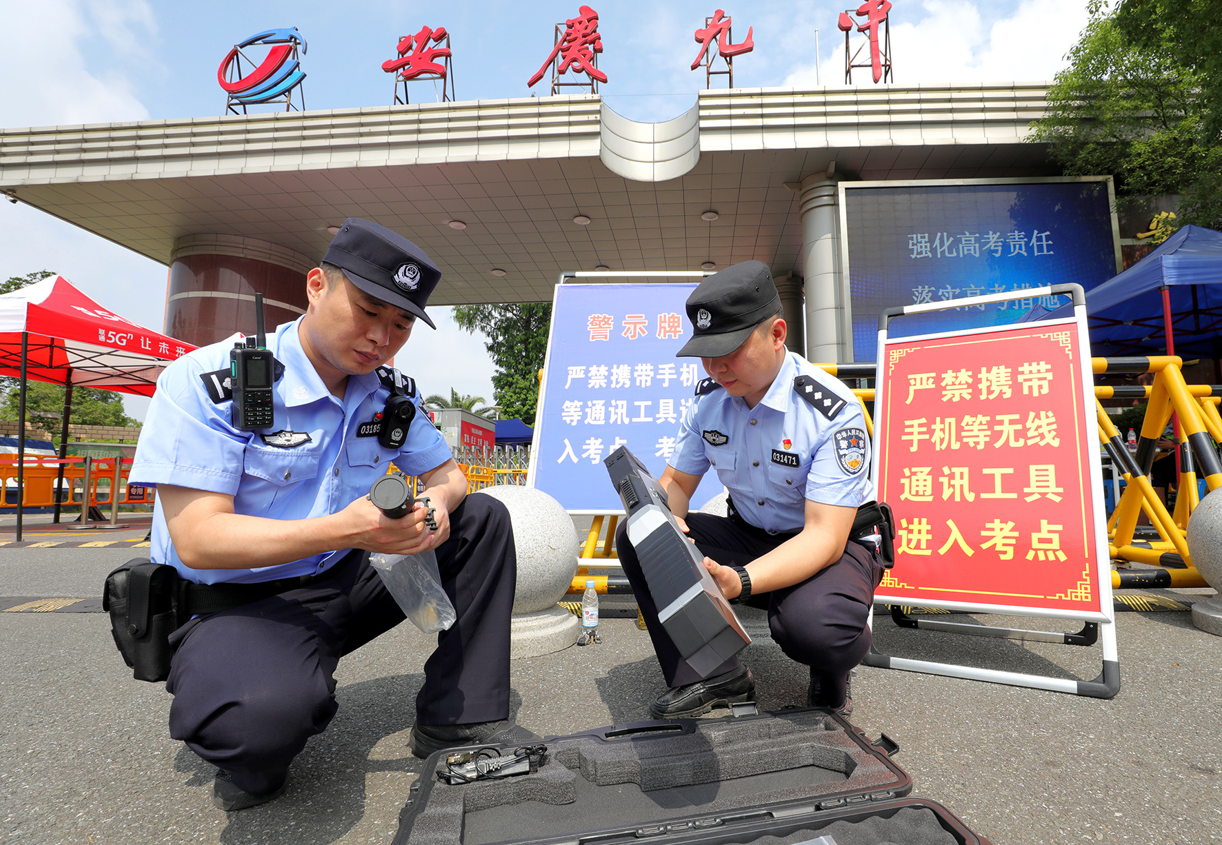 6月7日,安徽省安慶市公安局經(jīng)開分局民警正在利用無人機(jī)反制設(shè)備對(duì)考點(diǎn)周邊進(jìn)行空中安全管控。