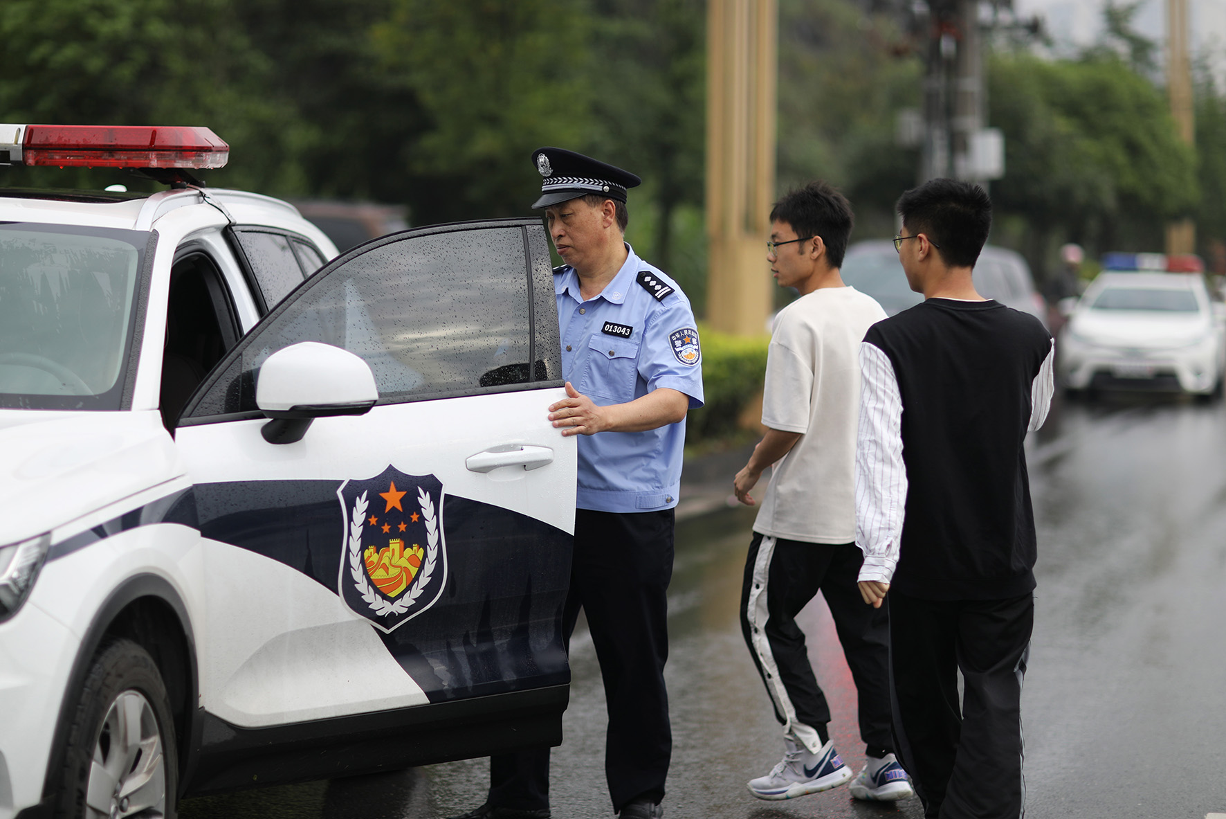 6月8日,貴州省赤水市公安局執(zhí)勤民警在第三中學(xué)考點(diǎn)準(zhǔn)備駕車幫助一位考生去取忘帶的準(zhǔn)考證。