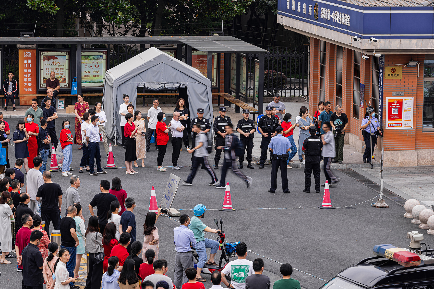 6月7日,浙江省嘉興市公安局南湖區(qū)分局民警在考點(diǎn)通過定點(diǎn)值守和武裝巡邏,確保廣大考生安全順利參加高考。