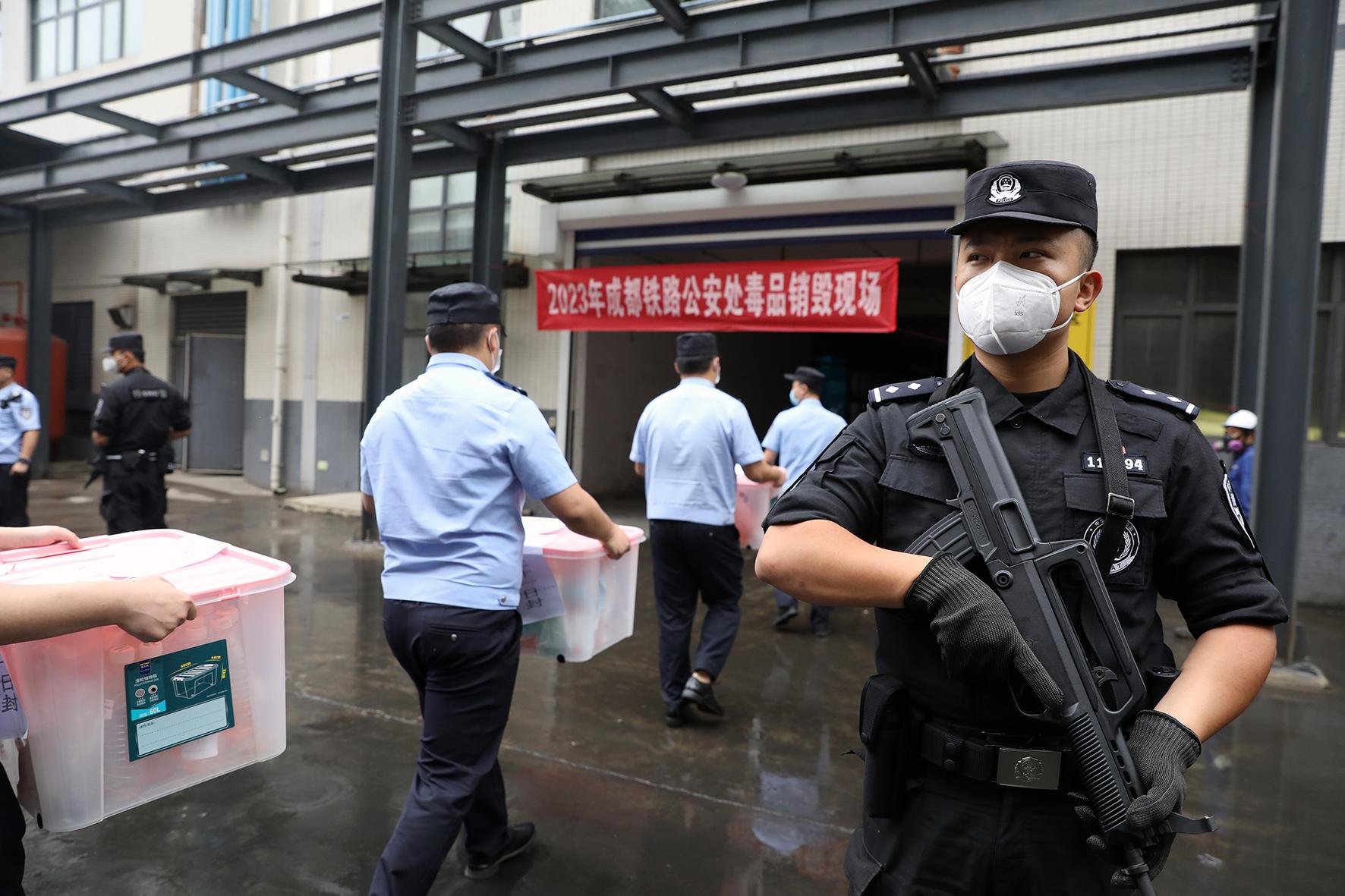 6月21日,成都鐵路公安處在四川省成都市郊的危險廢物處置中心開展“銷毒”行動,“無害化”集中銷毀各類毒品總重24.5公斤。