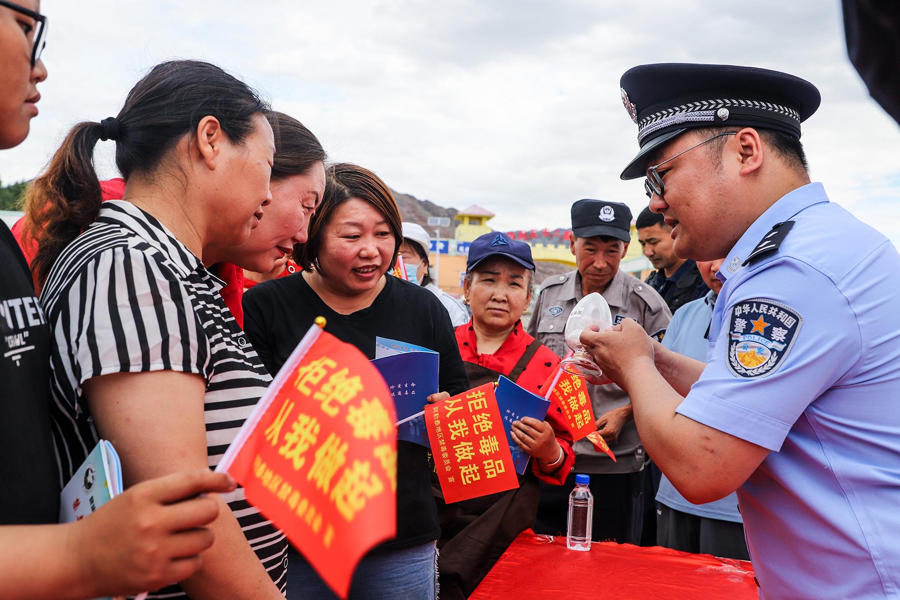 6月23日,新疆阿勒泰邊境管理支隊塘巴勒邊境檢查站聯(lián)合駐地派出所、海關(guān)、禁毒大隊等單位,在塔克什肯口岸商貿(mào)城廣場舉行以“健康人生 綠色無毒”為主題的禁毒宣傳教育活動。