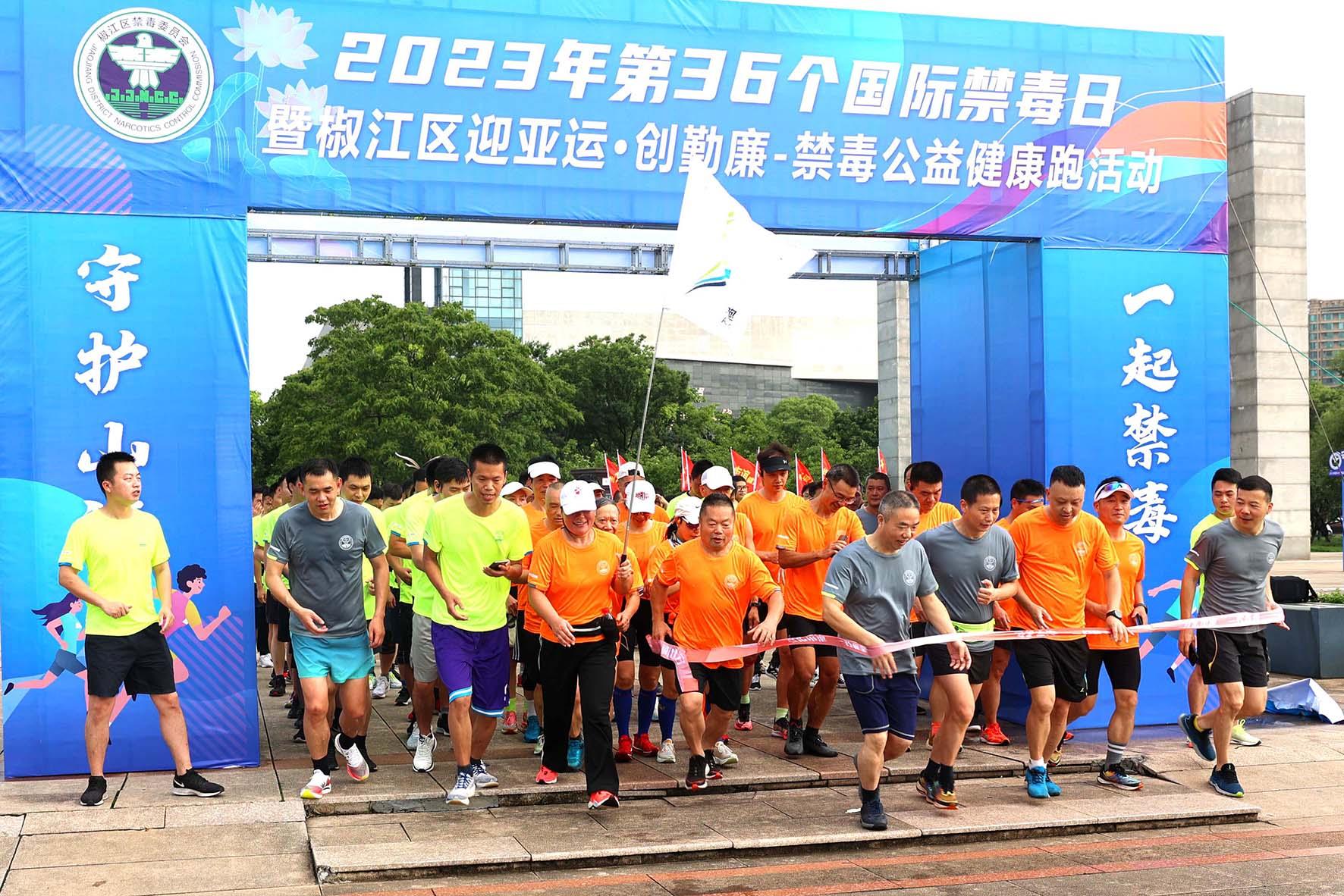 6月25日,浙江省臺州市公安局椒江分局在市民廣場主辦“守護(hù)山海 一起禁毒”為主題的“6·26”國際禁毒日公益健康跑宣傳活動。