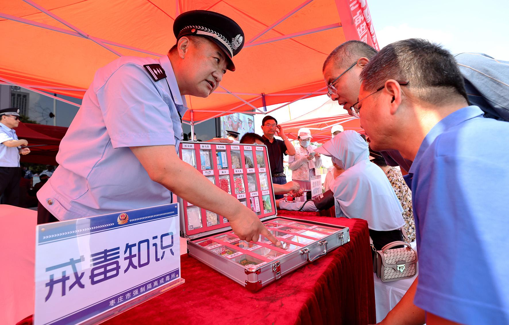 6月26日,山東省棗莊市公安、司法等部門在光明廣場開展以“健康人生 綠色無毒”為主題的禁毒宣傳活動(dòng)。