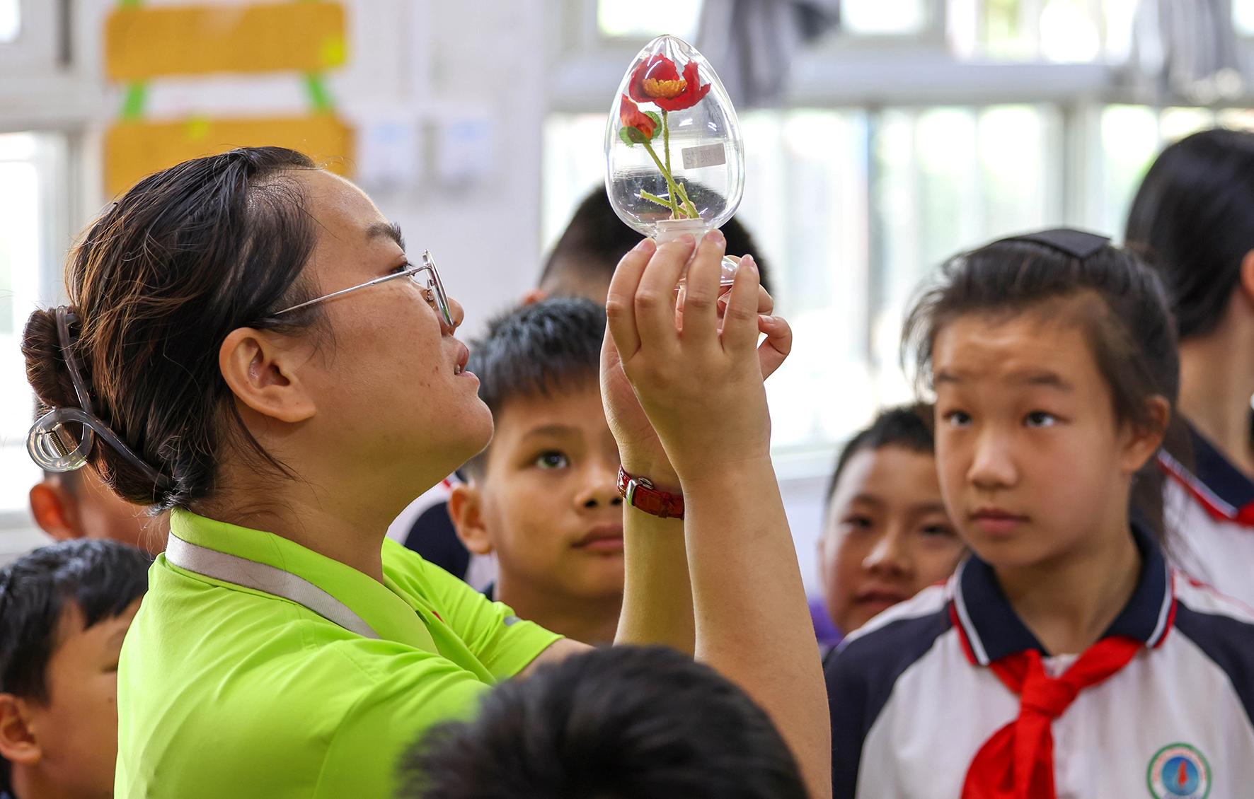 6月26日,安徽省當(dāng)涂縣公安局石橋派出所民輔警用仿真毒品樣本向?qū)W生講解毒品危害。