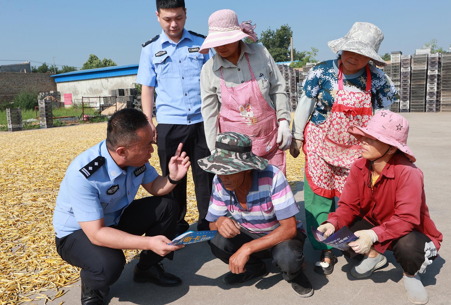 7月17日,陜西省大荔縣公安局蘇村派出所民警深入黃花菜加工產(chǎn)地,開展“面對面”反詐宣傳活動。