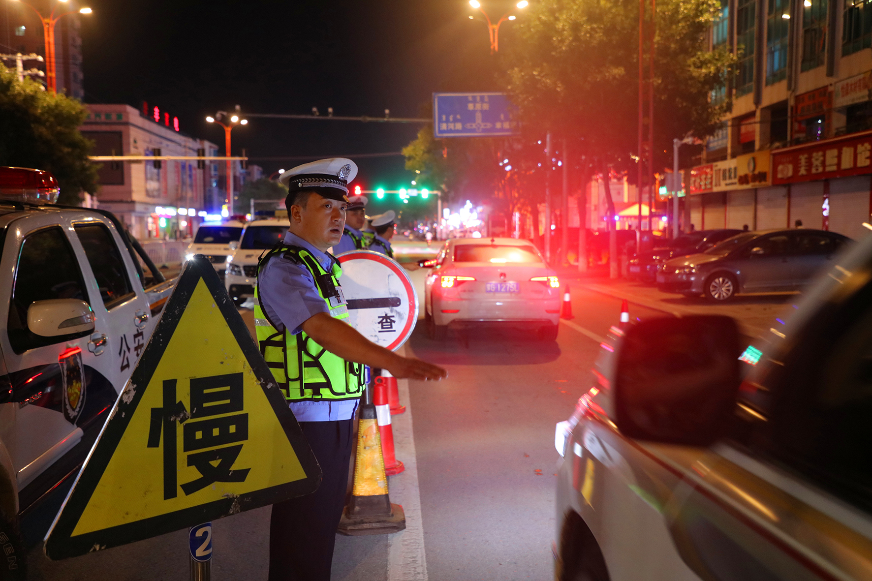 圖為8月12日晚,奈曼旗公安局交管大隊(duì)民警在重點(diǎn)路段開展夜查。