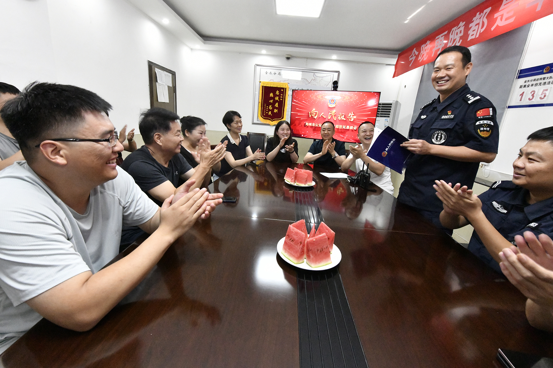 8月22日,河南省鄭州市公安局金水分局巡特警向轄區(qū)群眾代表開展“向人民報告”匯報工作活動。
