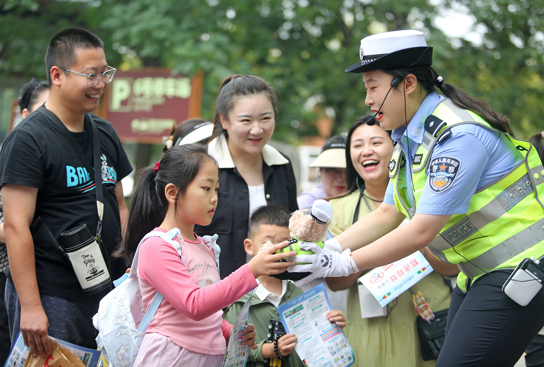 8月24日,陜西省華陰市華山景區(qū)廣場,民警為回答對(duì)問題的小朋友贈(zèng)送“交警小熊”。當(dāng)日,“全國百城百臺(tái)100小時(shí)”直播聯(lián)動(dòng)陜西站第九場活動(dòng)走進(jìn)渭南華陰市、潼關(guān)縣。活動(dòng)以“文明‘陜’亮出行·安全暢游三秦——暢行中國·百城百臺(tái)夏季說安全”為主題,通過直播聯(lián)動(dòng),全媒體矩陣宣講交通安全知識(shí),傳遞交通文明理念。