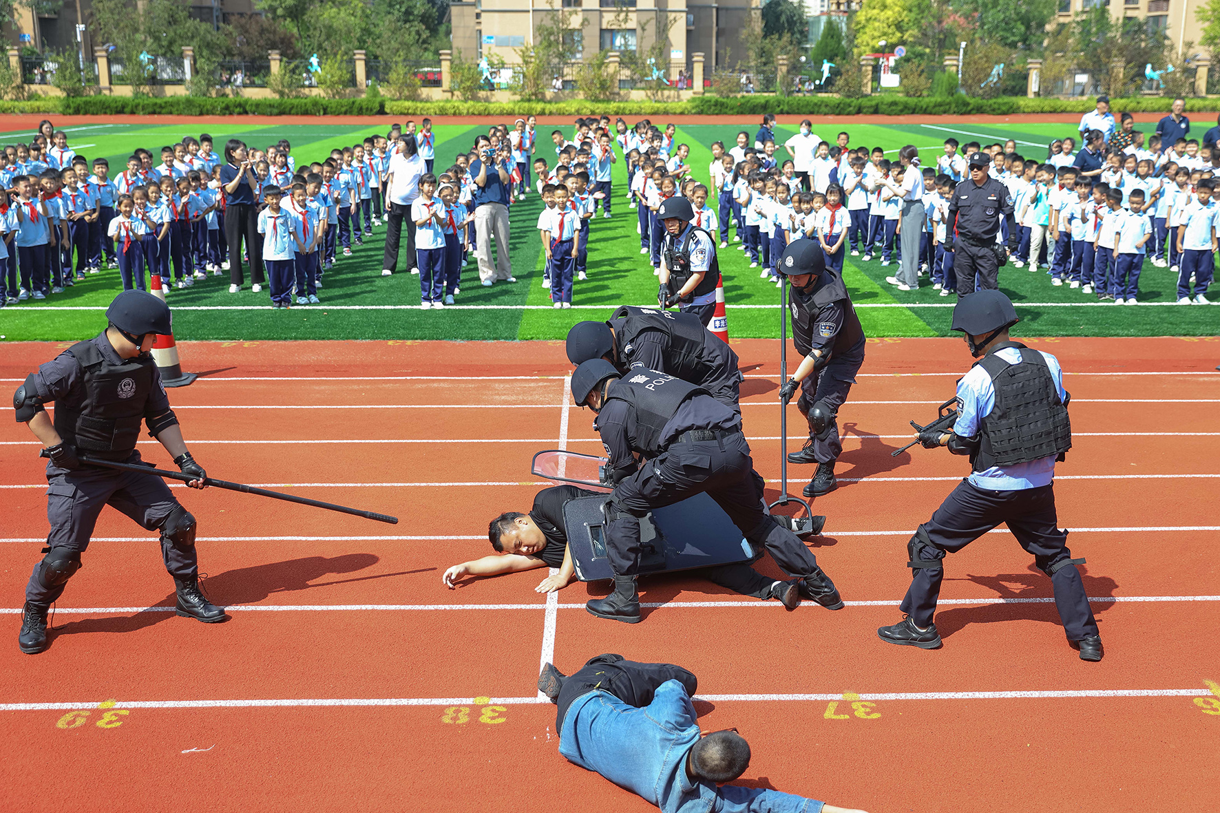 8月30日,河南省鄭州市公安局金水分局巡特警與花園路派出所的民輔警為轄區(qū)學校師生開展上好“開學第一課”活動。