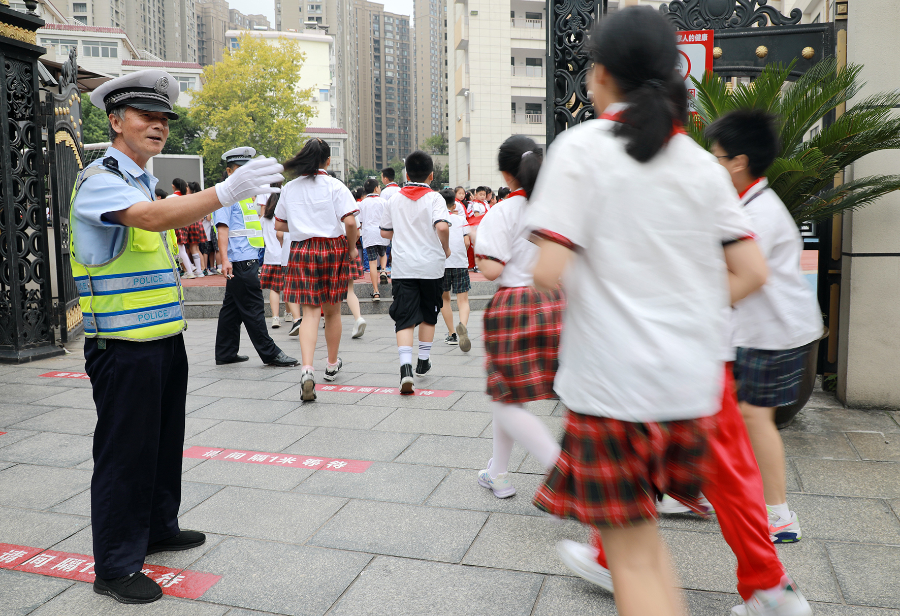 9月1日,江西省九江市公安局交管支隊第一大隊執(zhí)勤輔警在轄區(qū)湖濱小學門口護送小學生們安全進入校園。