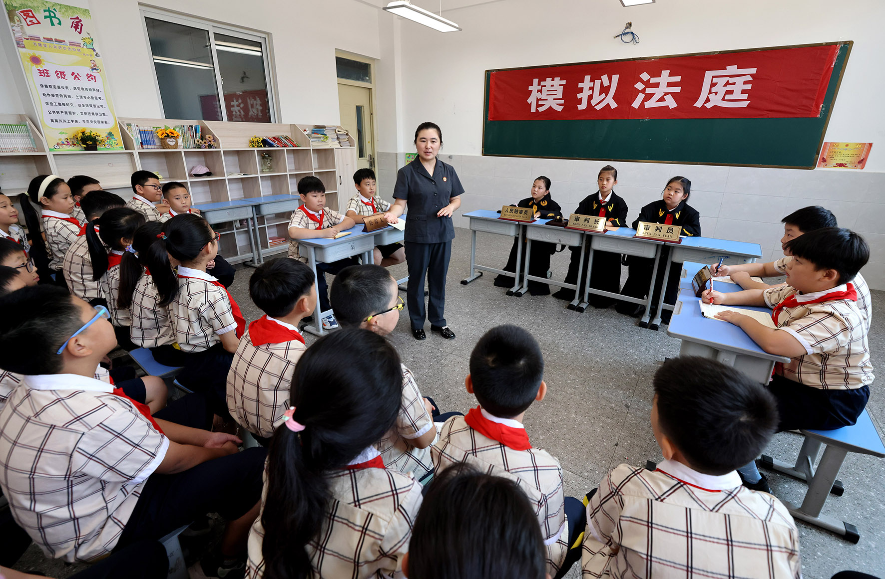 9月1日,山東省棗莊市市中區(qū)人民法院法官在東湖小學給學生們講解模擬法庭的“庭審”程序。當日,棗莊市市中區(qū)人民法院組織法官走進校園,為學生上好新學期法治教育第一課。