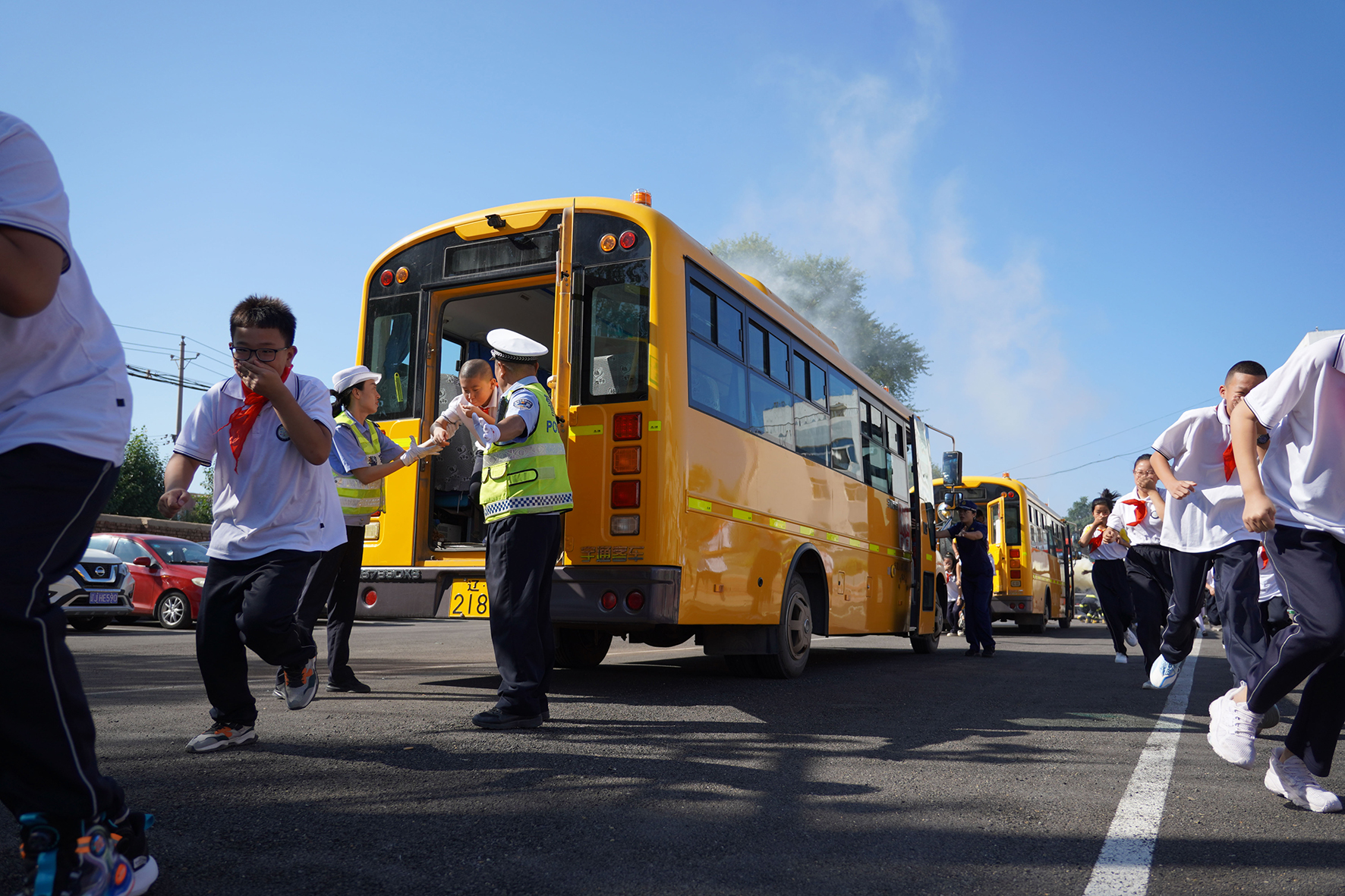 9月1日,開學第一天。遼寧省阜新市公安局交警支隊太平大隊聯(lián)合太平區(qū)消防大隊走進阜新市城南小學開展“知危險 會避險”校車自燃事故應急演練活動。