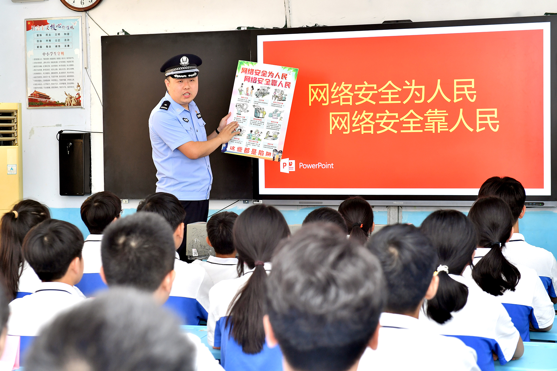 9月14日,山東省棗莊市公安局臺兒莊分局民警在第三十九中學給學生上網(wǎng)絡安全知識課。