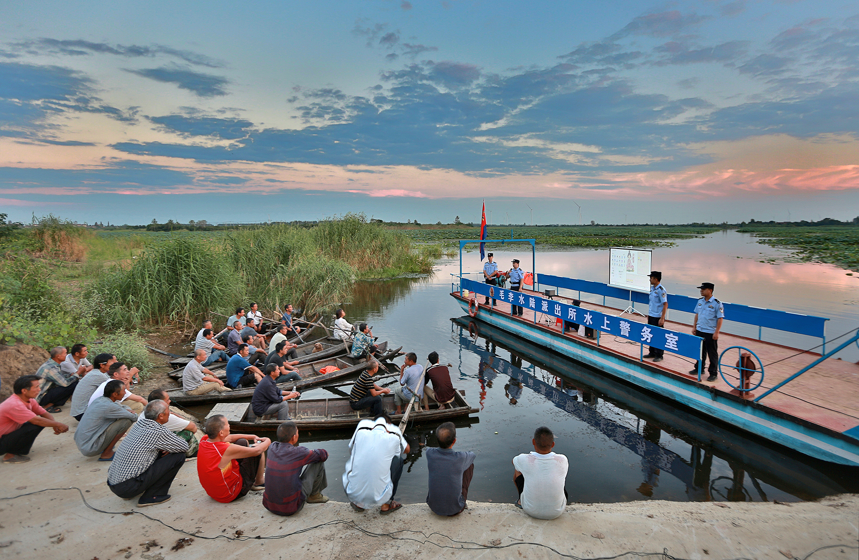 圖為9月14日傍晚,毛李水陸派出所民警在借糧湖畔,通過“流動(dòng)防?!逼桨舱n堂為村民放送反詐電影。
