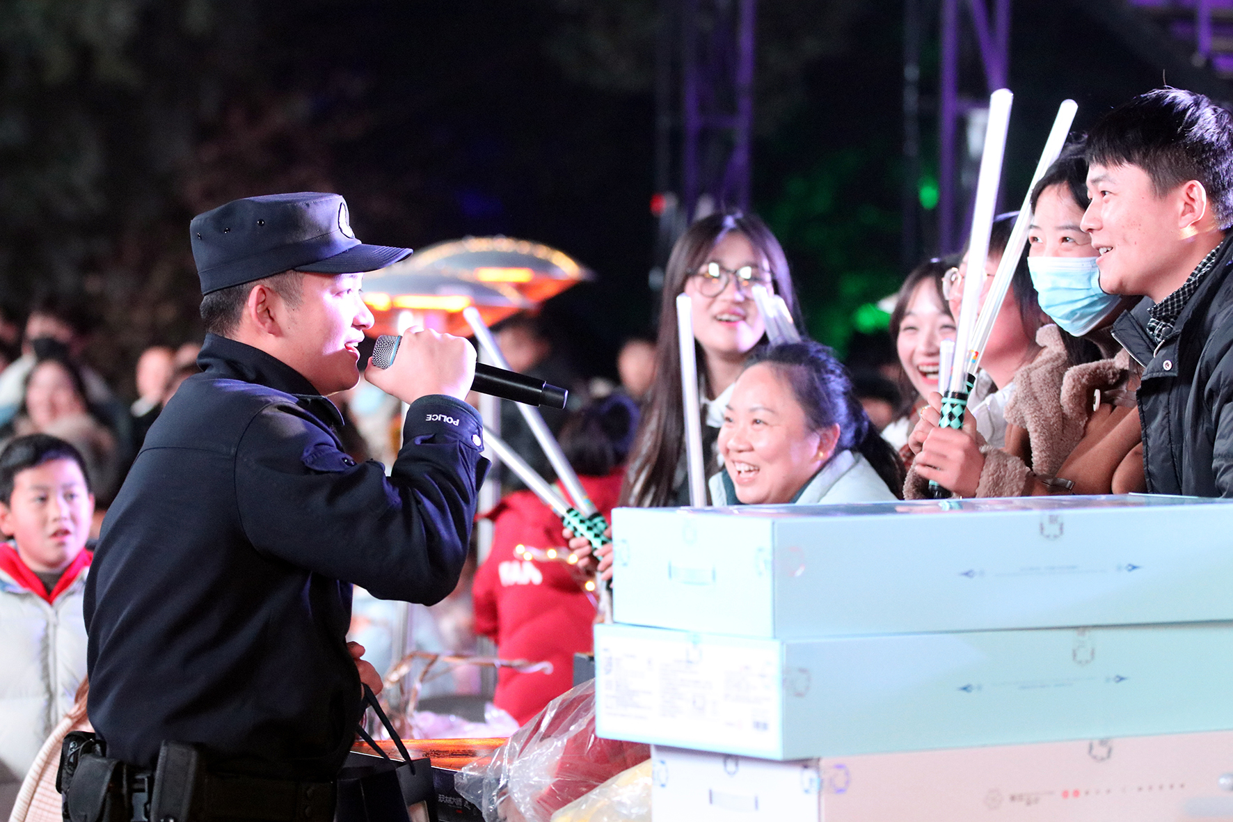 2023年12月31日,安徽省蕪湖市方特景區(qū)舉行大型跨年夜慶?;顒?dòng)。蕪湖市公安局民警現(xiàn)場(chǎng)與游客互動(dòng),宣傳反詐、交通等安全知識(shí)。