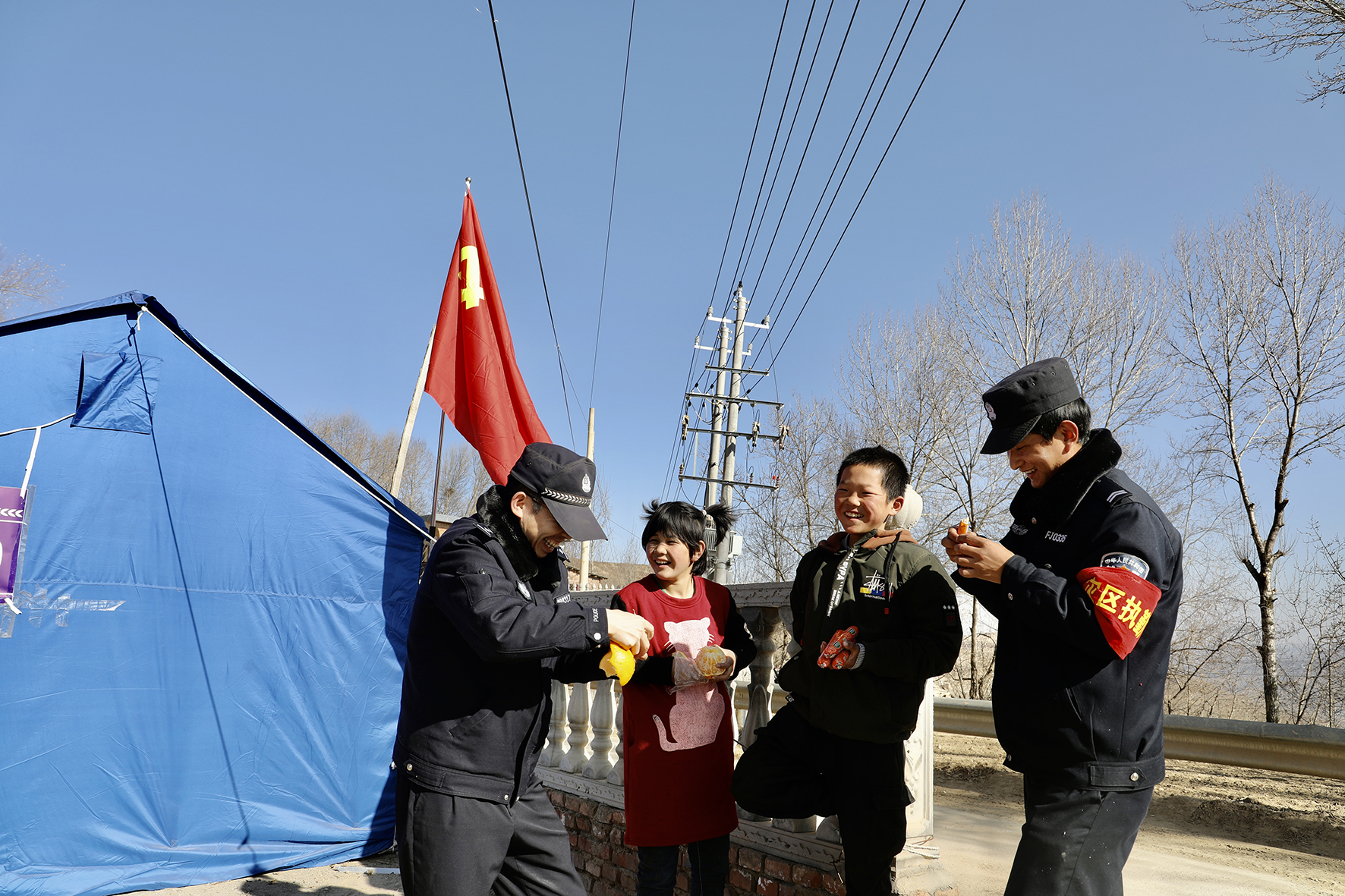 1月1日,甘肅省東鄉(xiāng)縣公安局民輔警在積石山縣柳溝鄉(xiāng)袁家村執(zhí)勤期間,幾名小朋友為民輔警送上自己制作的手工、圖畫和親筆信,用自己獨(dú)特的方式向抗震前線110的民輔警送上新年的第一份禮物。