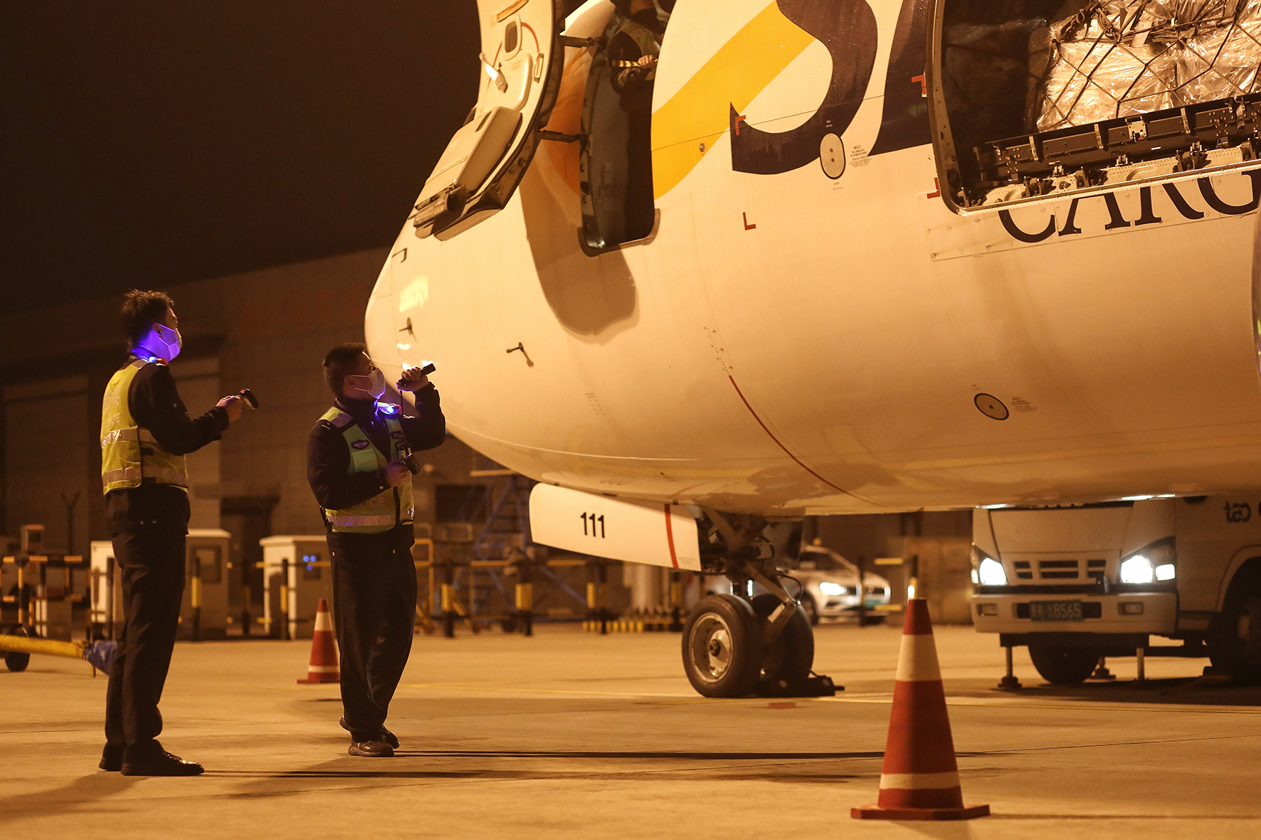 1月1日,山東出入境邊防檢查總站青島機(jī)場(chǎng)邊檢站民警對(duì)新年的首架國際貨運(yùn)航班進(jìn)行清艙檢查。