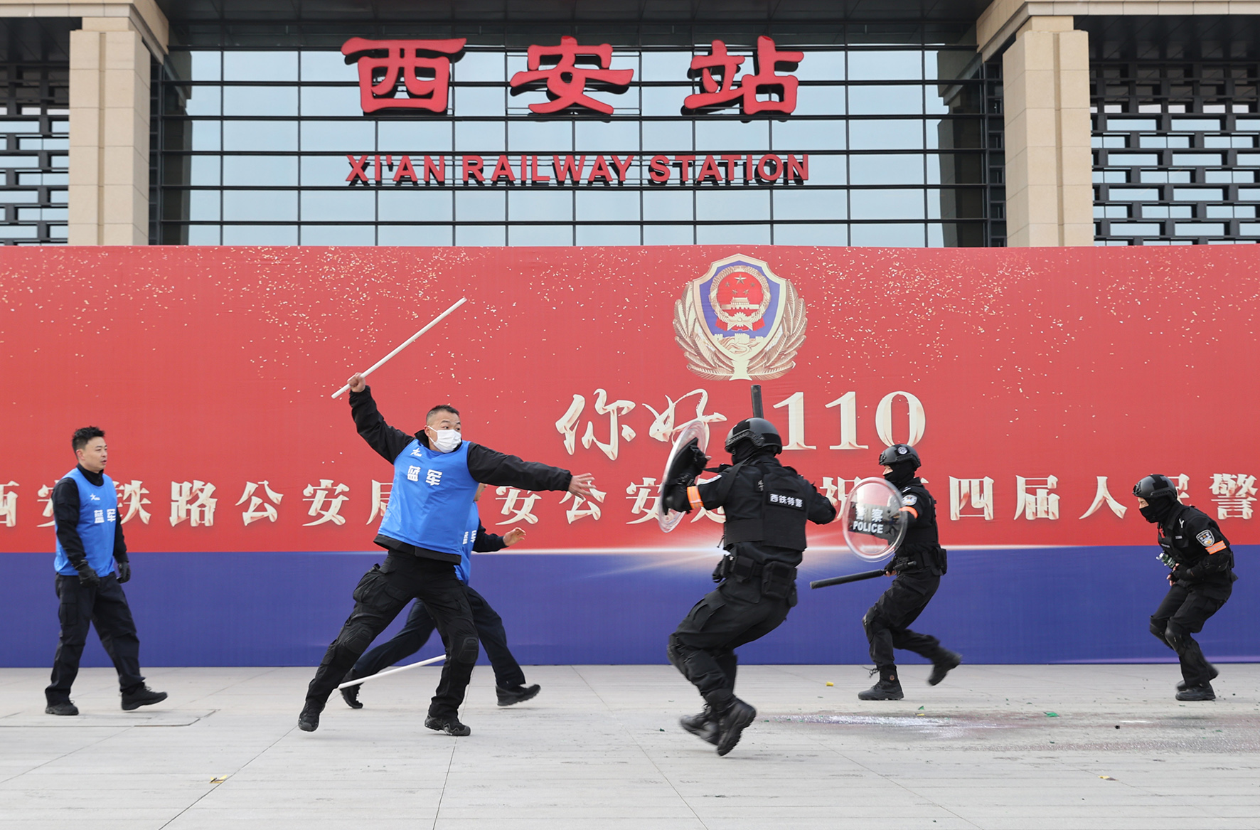 1月7日,西安火車站北廣場(chǎng),西安鐵路公安處特警隊(duì)員在進(jìn)行特警技戰(zhàn)術(shù)演練。
