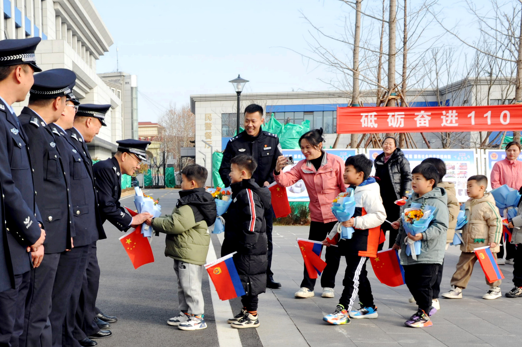 1月8日,山東省棗莊市幼兒園小朋友們向棗莊市公安局山亭分局民輔警代表獻(xiàn)花,送上節(jié)日祝福。