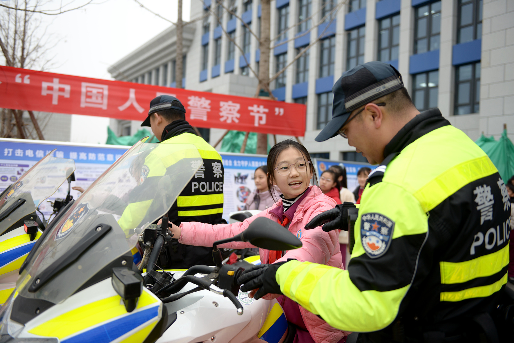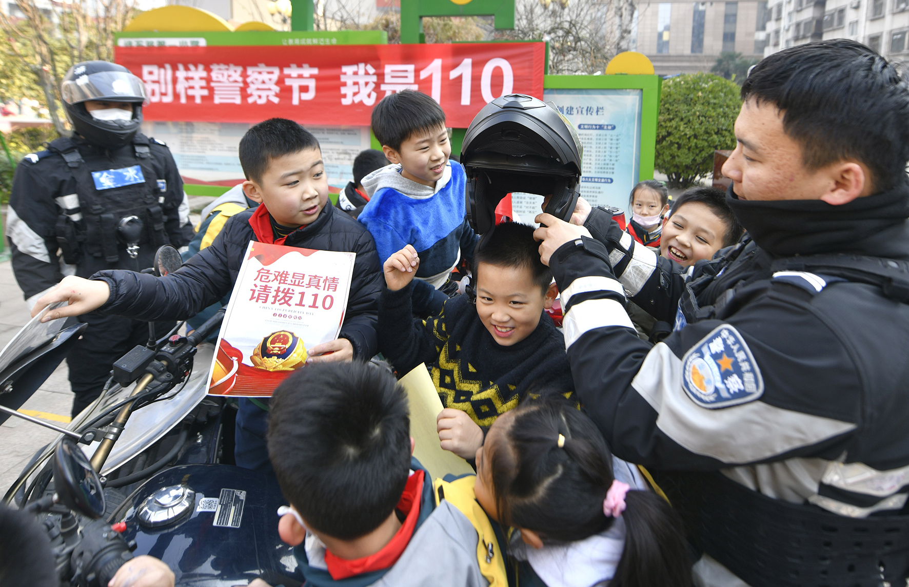 1月9日,河南省鄭州市公安局金水分局巡特警大隊(duì)隊(duì)員們走進(jìn)緯五路第一小學(xué),與師生們共同開(kāi)展“別樣警察節(jié) 我是110”宣傳活動(dòng)。