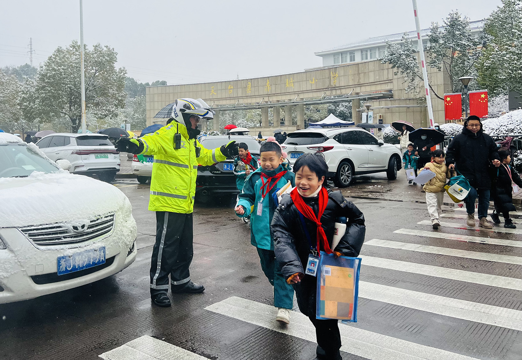 1月22日,浙江省臺(tái)州市天臺(tái)縣城區(qū)迎來(lái)入冬后首場(chǎng)降雪。天臺(tái)縣公安局交通警察大隊(duì)迅速開(kāi)啟“護(hù)學(xué)模式”,增派護(hù)學(xué)崗警力,全力疏通上學(xué)高峰期交通秩序,保障師生出行安全。