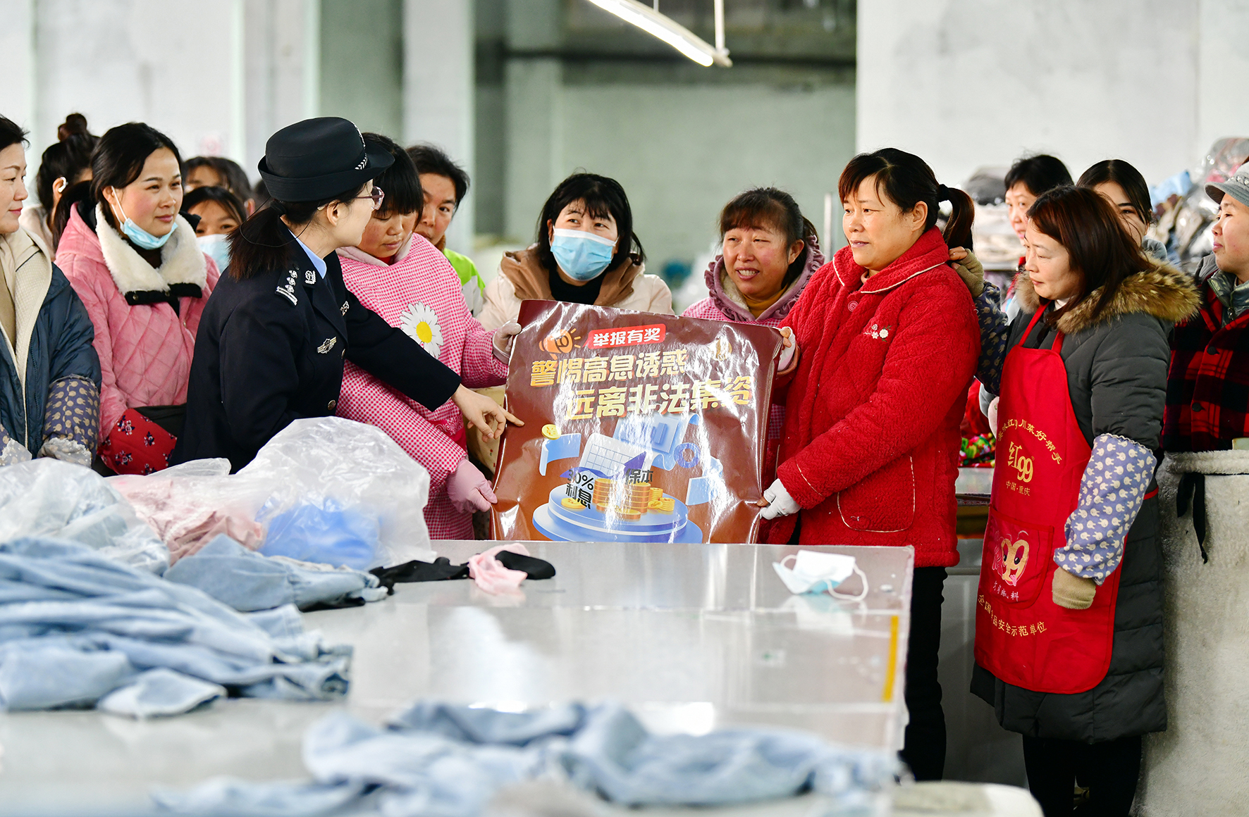 1月24日,安徽省阜南縣公安局經(jīng)偵民警在經(jīng)濟(jì)開發(fā)區(qū)一企業(yè)車間內(nèi)向員工宣講防范非法集資知識,引導(dǎo)員工自覺遠(yuǎn)離非法集資、“套路貸”等非法金融活動,守好自己的“錢袋子”。