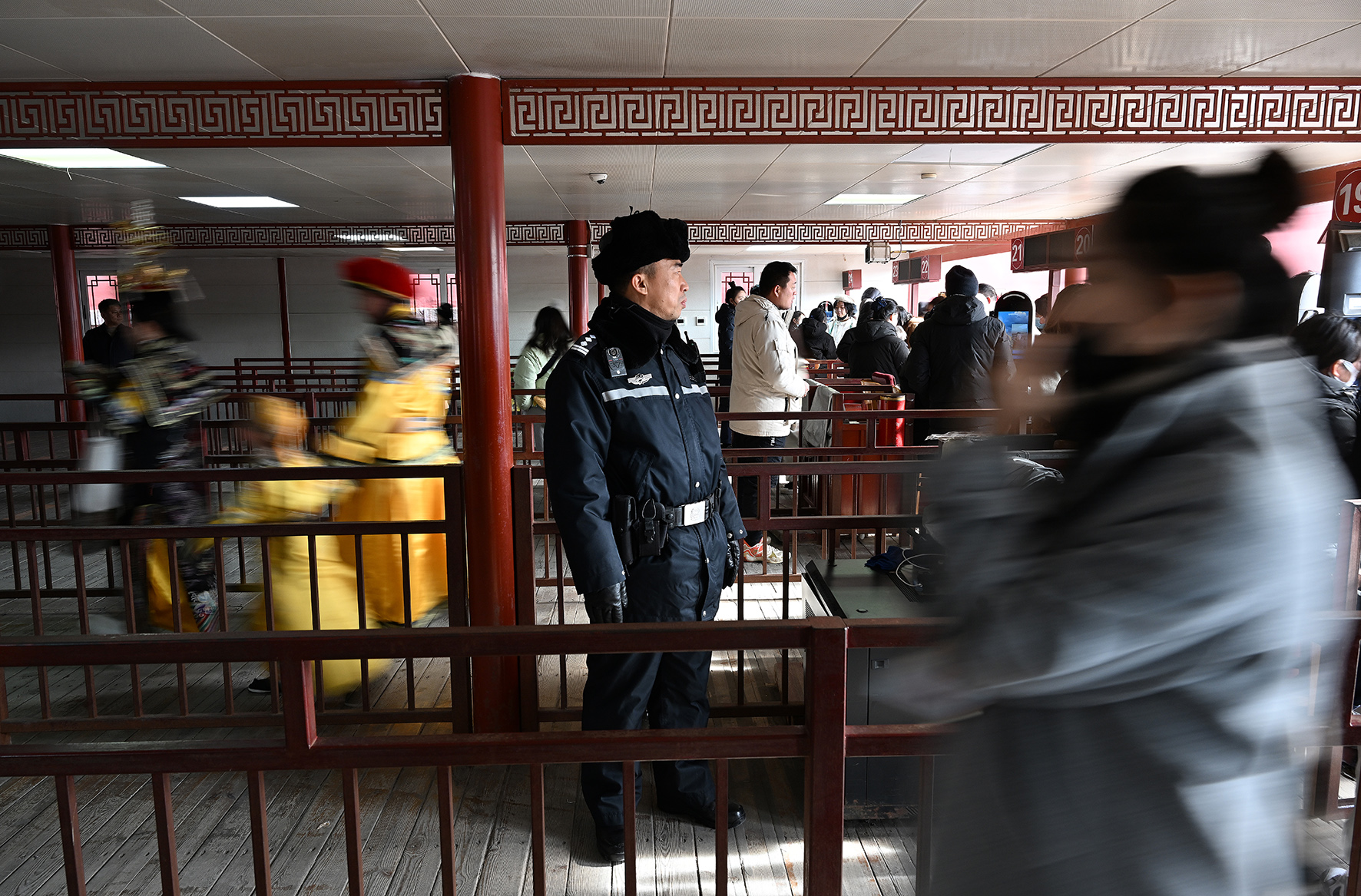民警在進(jìn)入午門的安檢通道前維持秩序。