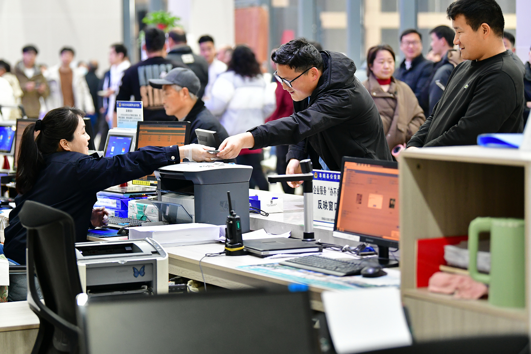 2月18日,安徽省阜南縣公安局交管大隊(duì)車管所工作人員在為群眾辦理車駕管業(yè)務(wù)。春節(jié)假期結(jié)束第一天,阜南縣公安局交管大隊(duì)車管所服務(wù)大廳內(nèi)迎來業(yè)務(wù)高峰,車管所開啟“延時(shí)服務(wù)”工作模式,全力保障業(yè)務(wù)辦理高效有序,為群眾紓困解難。