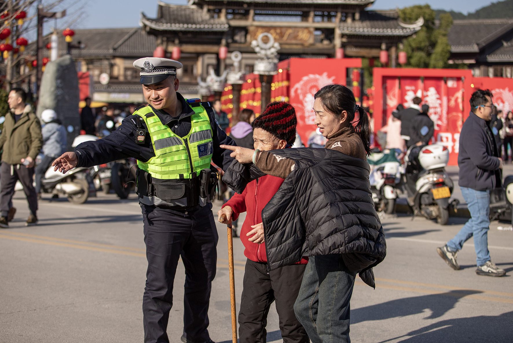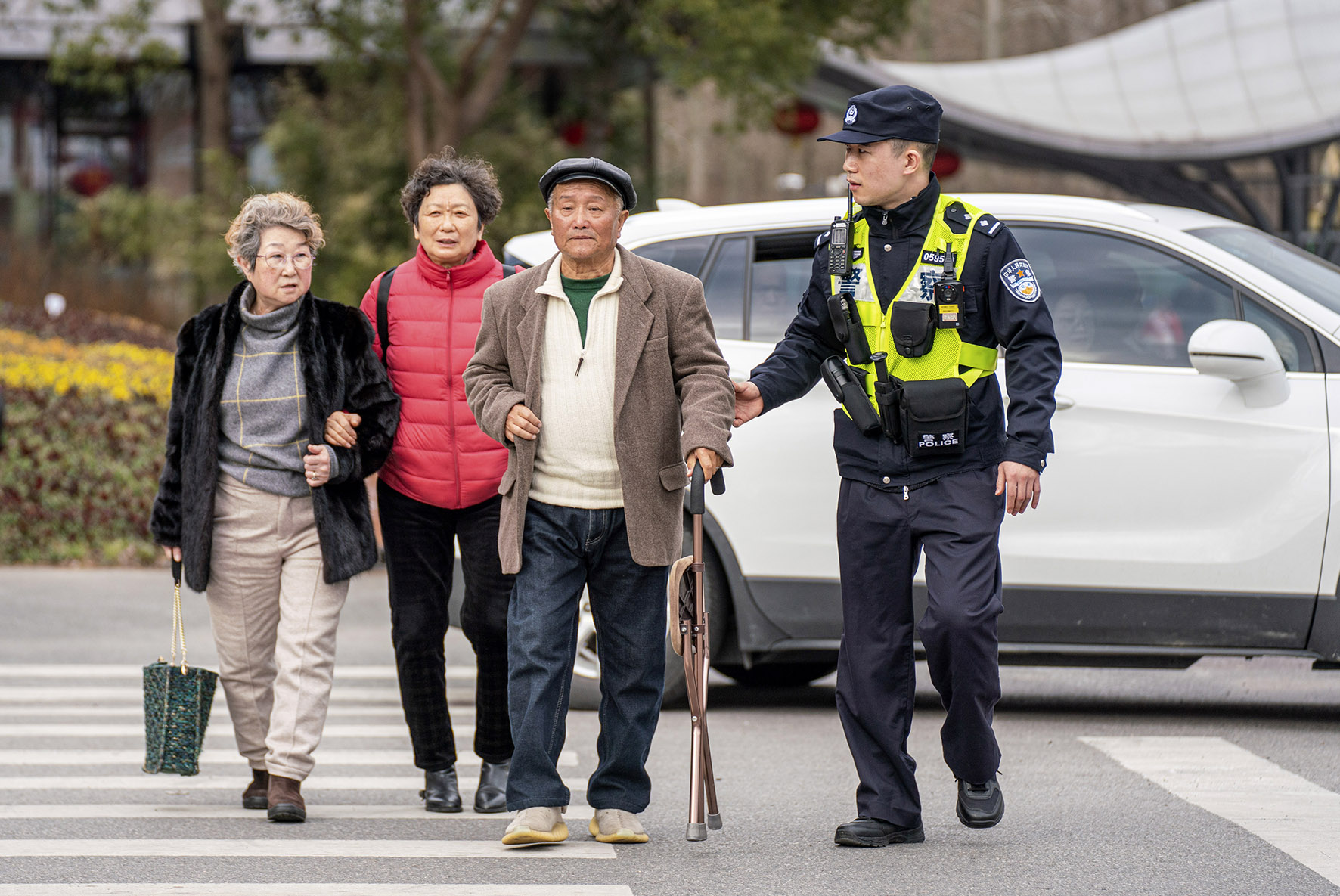 2月16日,上海市公安局崇明分局建設(shè)派出所民警在東平國家森林公園門口護(hù)送行動(dòng)不便的老人過馬路。