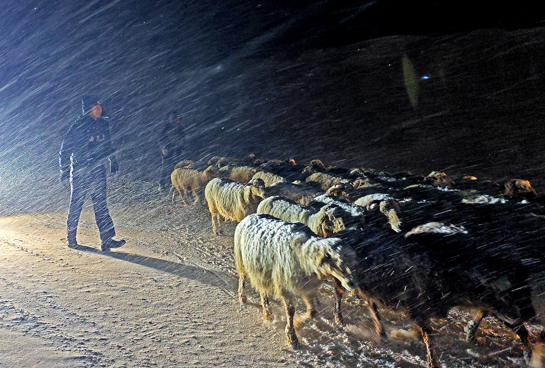 2月16日晚,新疆伊犁夏特邊境派出所接到牧民轉(zhuǎn)場途中遭遇暴風(fēng)雪被困的報(bào)警求助,民警們經(jīng)過三個(gè)小時(shí)的長途跋涉,成功將牧民和1000余只牲畜平安護(hù)送至定居點(diǎn)。