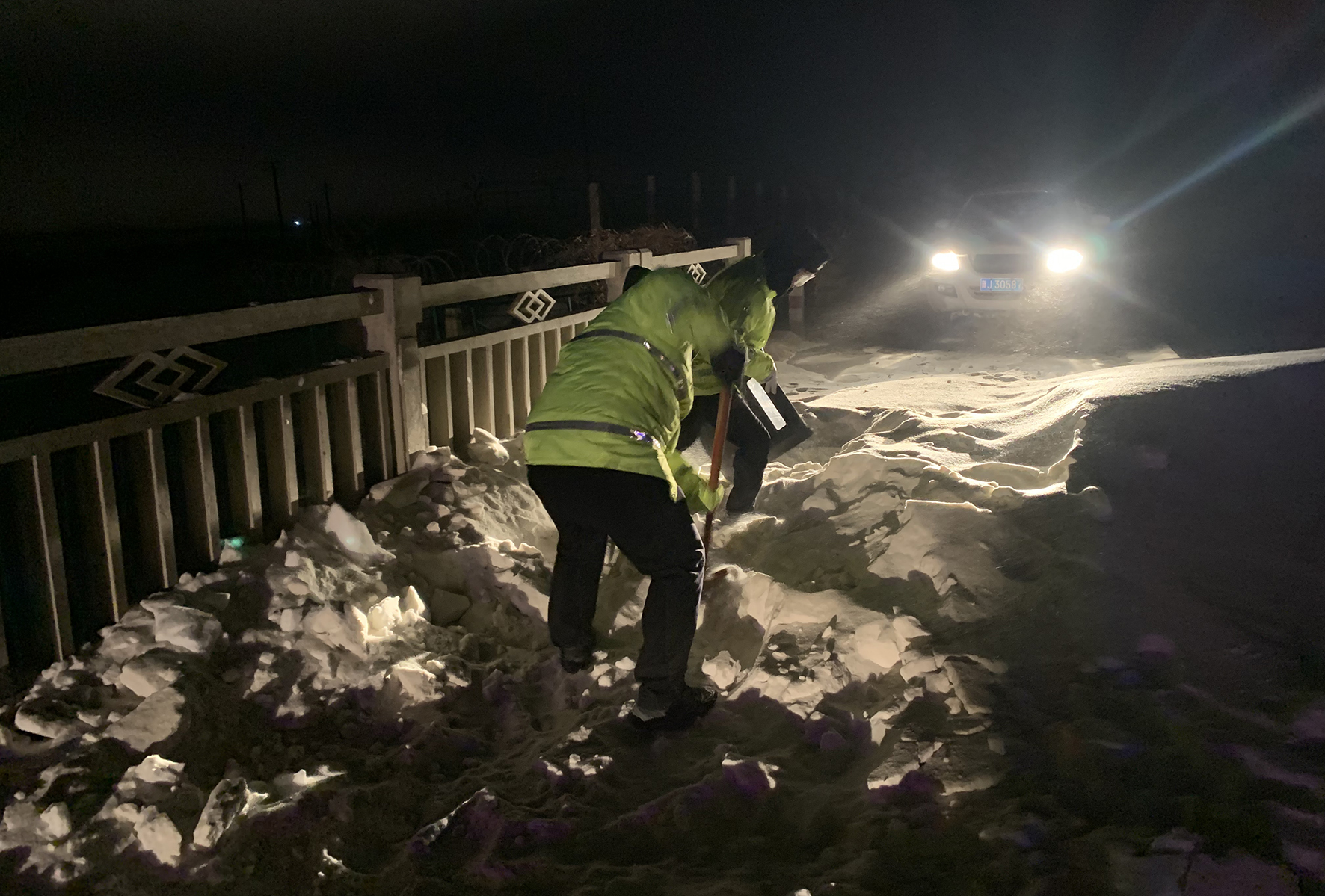 2月16日晚11時(shí)許,新疆克拉瑪依市公安局白堿灘區(qū)分局民警冒著風(fēng)雪救援被困車輛和群眾。
