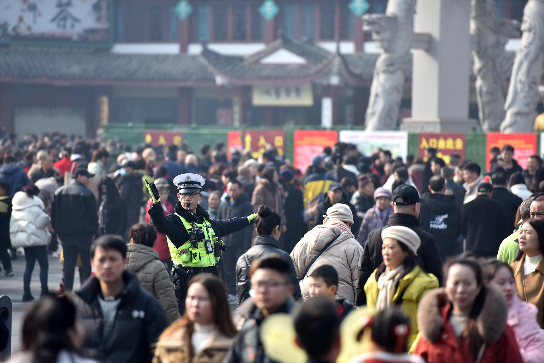 2月12日,湖北省鐘祥市公安局交警大隊(duì)民警在景區(qū)用“小喇叭”提醒游客注意安全。