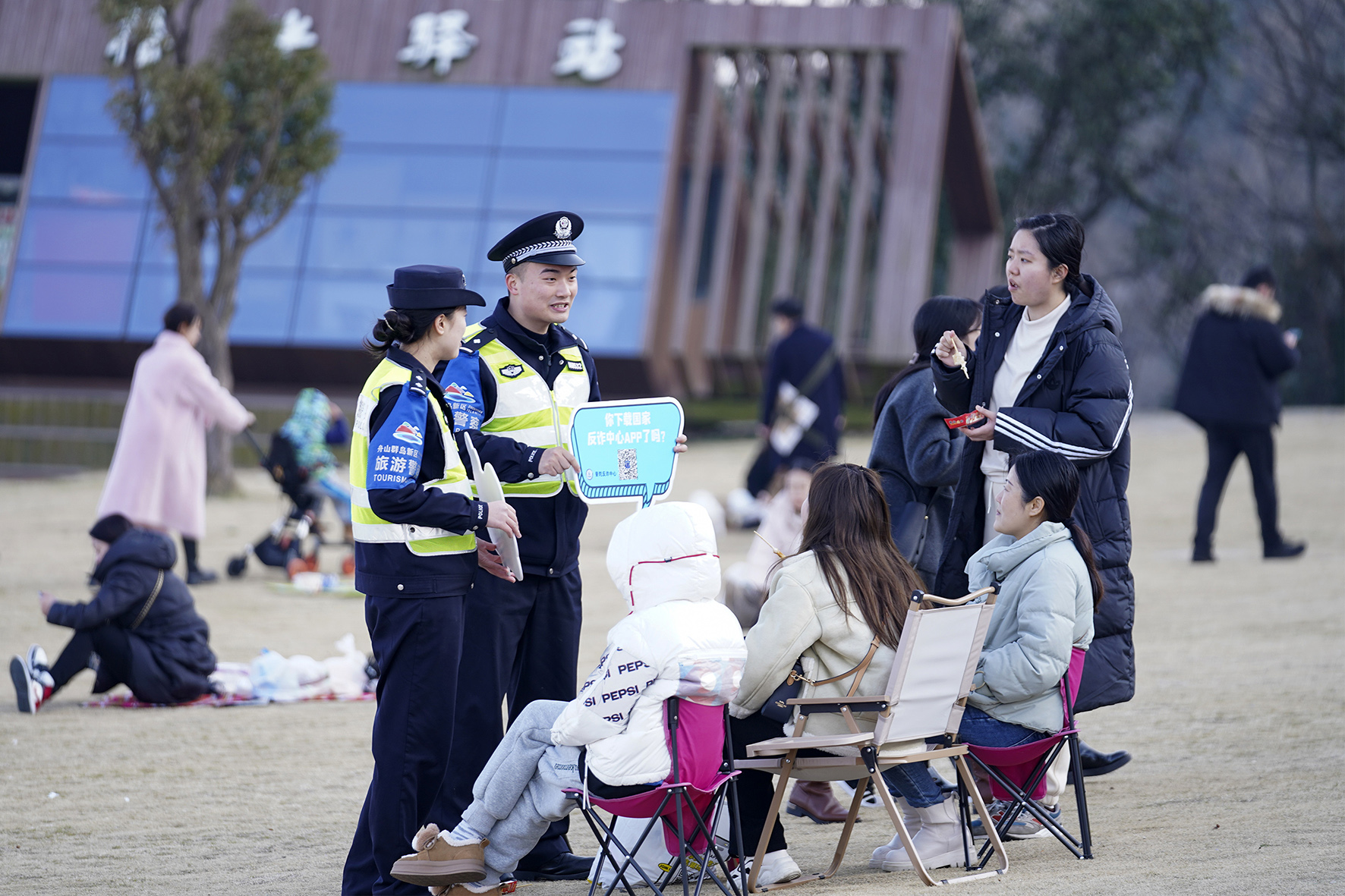 2月11日,浙江省舟山市公安局普陀區(qū)分局東港派出所民警在景點(diǎn)開展安全巡查、反詐宣傳及服務(wù)游客工作,守護(hù)景點(diǎn)平安。
