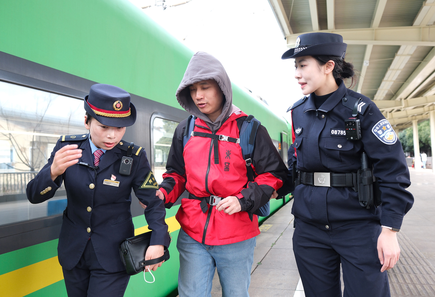 2月17日,杭州鐵路公安處乘警和列車工作人員在站臺(tái)上幫助一名盲人旅客乘車。
