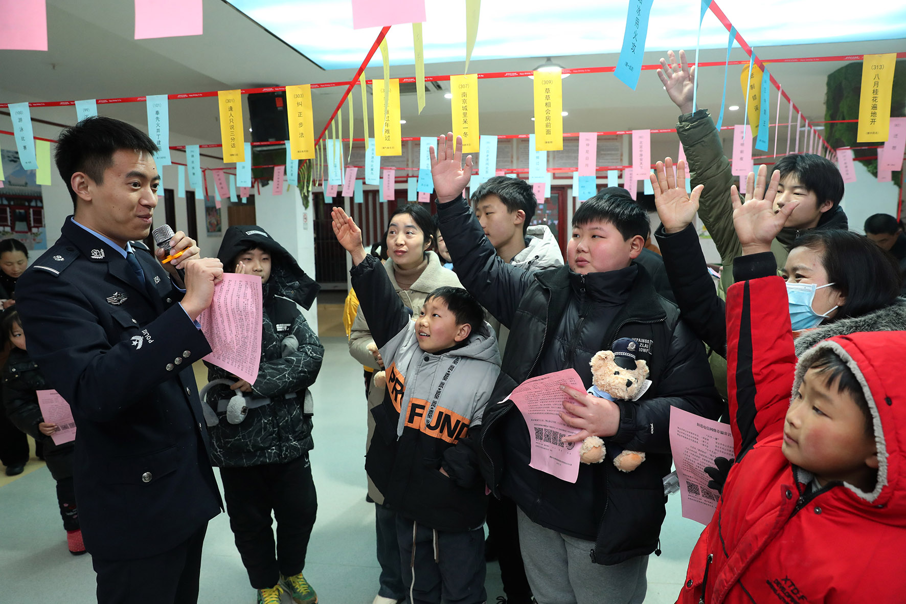 2月24日,安徽省蒙城縣“慶新春 鬧元宵”有獎(jiǎng)猜謎活動(dòng)現(xiàn)場(chǎng),民警向家長和孩子們介紹燈謎游戲中的反詐知識(shí)。