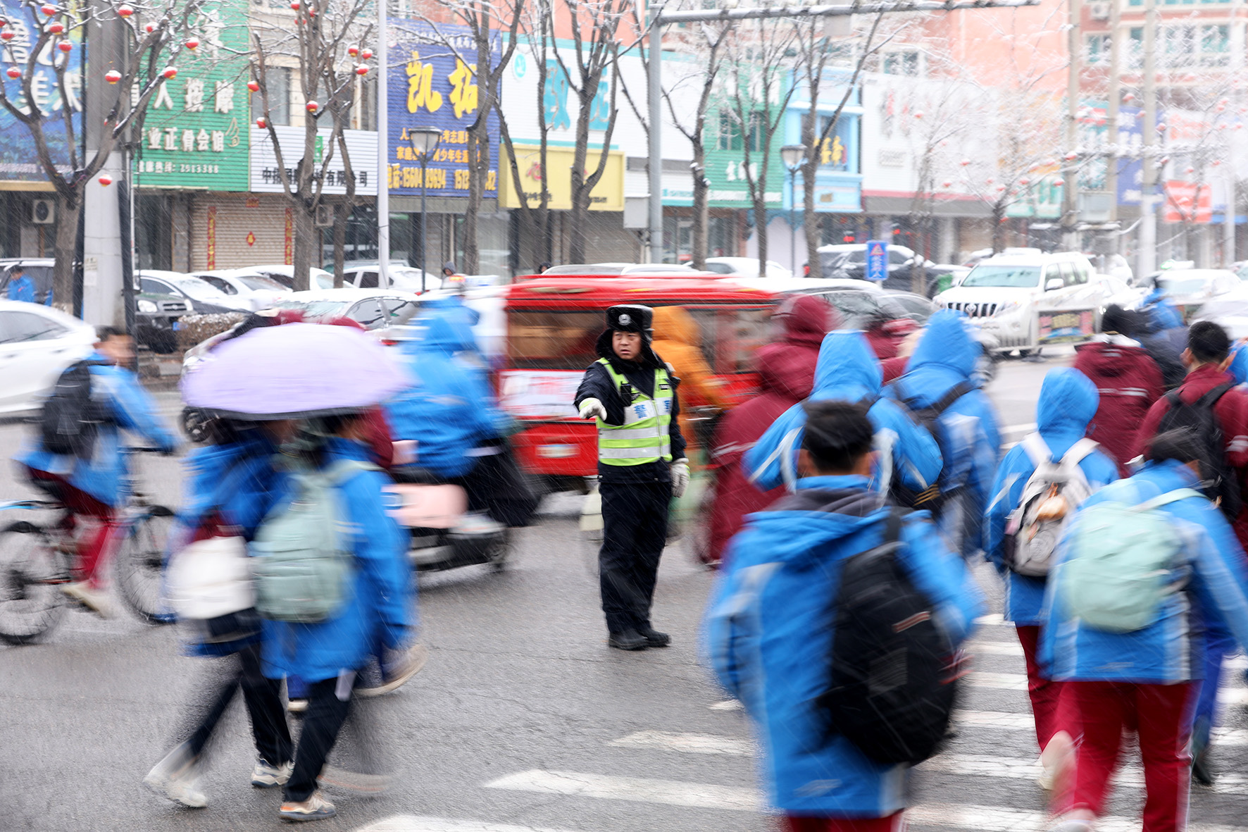 3月19日,遼寧省阜新市突降小雪。阜新市公安局交通警察支隊(duì)細(xì)河大隊(duì)民輔警頂風(fēng)冒雪,站好“護(hù)學(xué)崗”。