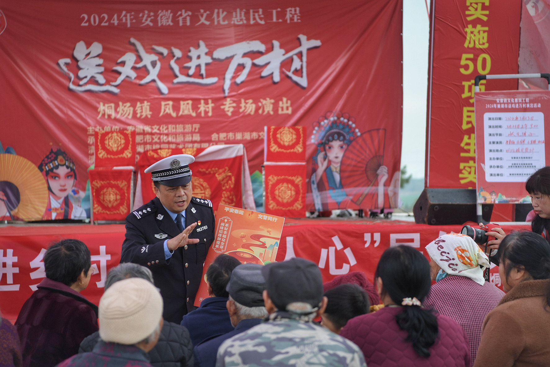 3月23日,安徽省巢湖市公安局交警大隊組織警力走進農村大戲臺、春游等地,開展春季出行交通安全常識普及。