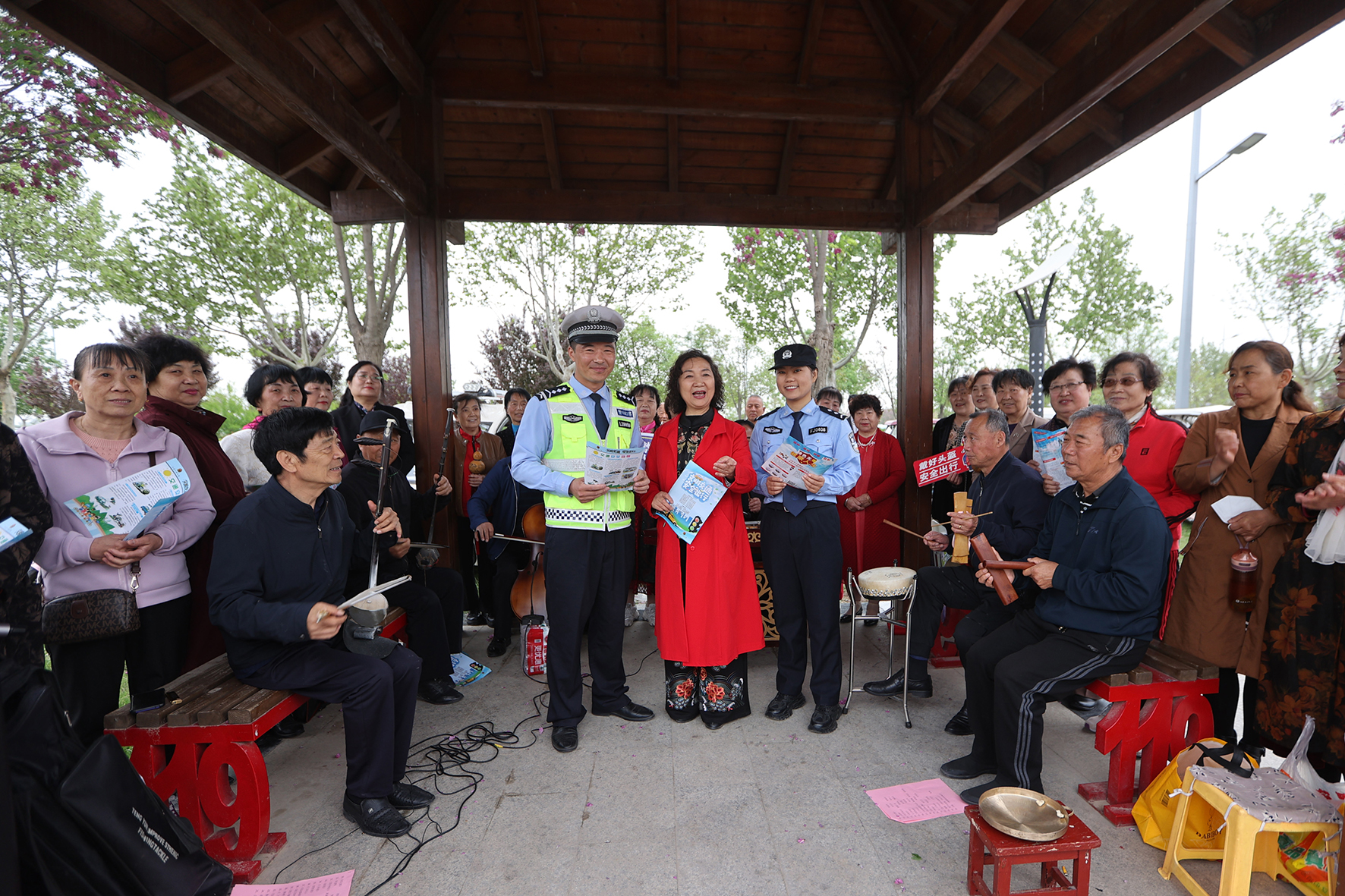 4月19日,陜西省大荔縣公安局交警大隊民警、禁毒大隊民警攜手,借助老年大學“自樂班”演出陣地開展交通安全和禁毒宣傳。