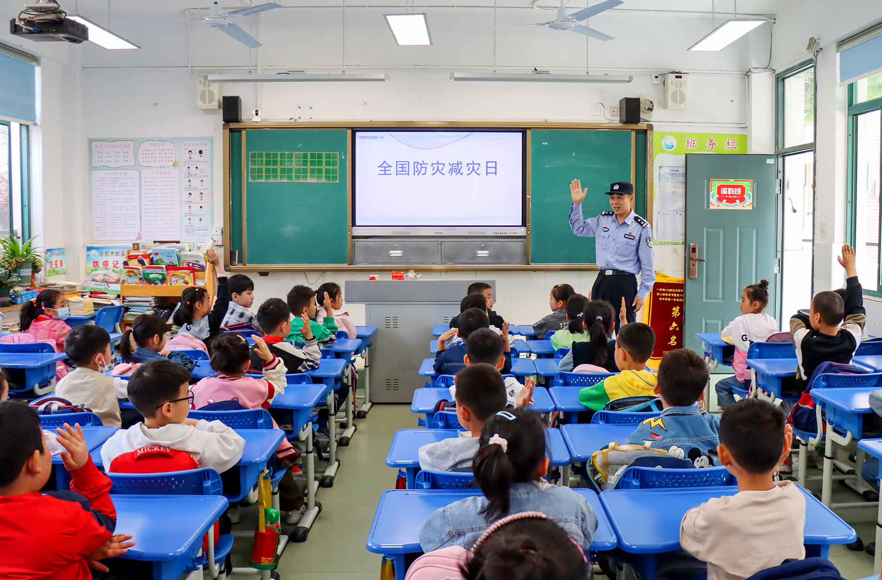 5月10日,安徽省舒城縣公安局闕店派出所民警在課堂上向?qū)W生講解防災(zāi)減災(zāi)相關(guān)知識(shí)。