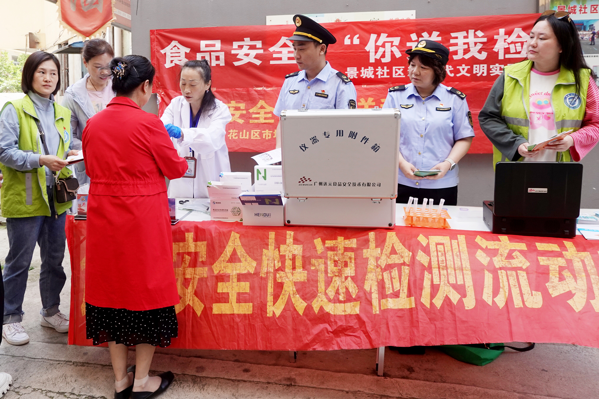 5月13日,安徽省馬鞍山市花山區(qū)桃源路街道景城社區(qū)聯(lián)合花山區(qū)市場監(jiān)督管理局桃源所,在師苑市場開展食品安全“你送我檢”活動,免費(fèi)為群眾提供食品安全快速檢測服務(wù)。